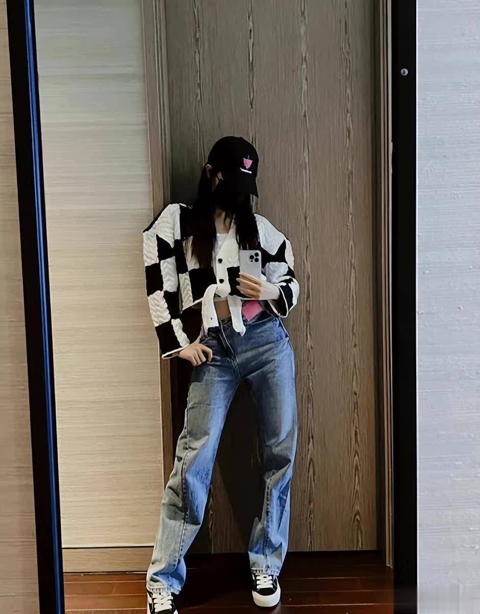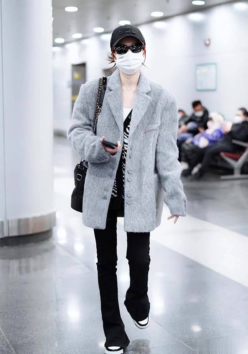 一般来讲,在搭配的过程中,我们讲究松紧配合的原则,而像徐璐的这套穿搭,宽松开衫搭配阔腿裤的组合,似乎有些不妥,但因为敞怀穿的穿法,以及内搭的紧身短款设计,轻松解决了版型松紧的搭配问题,避免了宽松设计可能出现的显胖感,而露脐的内搭长度,以及下装的高腰设计,轻松提高腰线位置,营造更为显长的双腿效果。